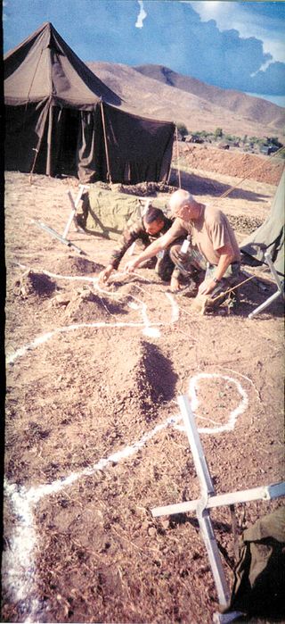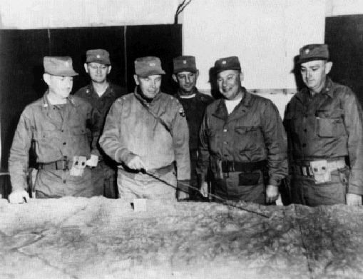 LTC Edward Rowny (second from left) studies a sand table terrain map at X Corps headquarters in Korea with MG Edward M. Almond (with pointer), commander of X Corps, and other staff members, 2 Oct 1950.