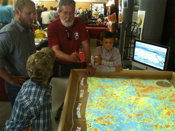 A computer pipes satellite imagery through a projector onto a tabletop sandbox (no really, an actual sandbox). Color-coded areas show where to move the sand (with your hands) to quickly create hills, mountain peaks and valleys. By the time you’re finished, you have a box with astonishingly accurate contours, overlaid by a topographical digital image that makes the whole thing look almost holographic.