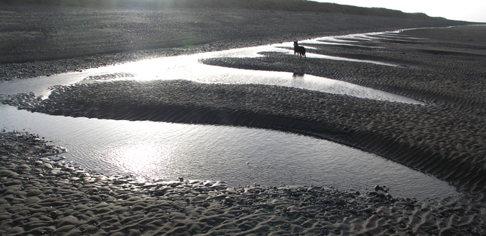So, since I had requested - weather permitting - a morning excursion to the coast, there I was on the beach, the timing perfect with sun and an outgoing tide, good company and an enthusiastic dog. But the evidence for violence was also apparent. The weather system and the deluge that had devastated Cockermouth and other valley towns had also hit the coast, where, even under normal circumstances, the tides and currents are immense. My companion, a regular observer of this landscape, described how the rows of rotted wooden fish trap posts that we could see running out across the sand flats had barely been visible before. Huge volumes of sand scoured away and flushed violently up the coast. This process was evident from the dramatic series of large sand waves visible high on the beach, just below the eroding dunes (photos below, dog for scale), their shoreward boundary dramatically linear and all suggestive of high velocity water movement.