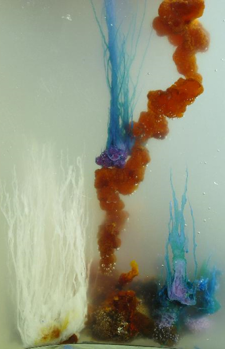 of different metal compounds, generally nitrates or chlorides of manganese, cobalt, copper, iron, and watch your garden grow. The metals combine with the waterglass to form insoluble metal silicates that precipitate and grow upwards to form exotic plant-like structures. The colour depends on the metal, just as the colour of glass depends on the metal added. The phenomenon was discovered in the 17th century, when waterglass was known as “oil of sand” and played a common role in alchemy. It would seem that Sir Isaac Newton, in his experiments in the transition between alchemy and “chymistry,” created magic gardens in oil of sand, the organic appearance of the structures confirming the old alchemical idea that metals have a kind of life and can “vegetate”.
