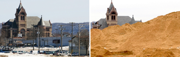 This demand, along with the enormous volume of water required, not does not frequently feature as an issue in the ‘debate’. With the boom in fracking in the US, demand for the right kind of sand has more than trebled in the last four years – the US Geological Survey estimates that 30 million tons of frac sand was produced in the US in 2013. Where from? Mostly Wisconsin and neighbouring Midwestern states. The seas that covered much of the US more than 450 million years ago deposited, and time and chemistry purified, sands ideal for hydraulic fracturing purposes. Although today these are sand_stones,_ the cement holding the grains together is weak and they can be easily mined and disintegrated back into sand. The scale of the sand-mining industry in Wisconsin and neighbouring parts of Minnesota has escalated dramatically in the last few years to the point where it has clearly become an environmental, social and health issue (the last particularly as a result of the generation of silica dust). At the same time, the industry is a welcome source of employment and state income, but fluctuations in the level of industry fracking activity hardly make for a stable economic benefit. The image at the head of this post is from a recent article by Minnesota Public Radio and shows two views of downtown Winona today and a year ago when the stockpile of sand that became known as ‘Mt. Frac’ filled a vacant lot. It has disappeared not because of the concerns rightly expressed by the local citizens but because of the fall in demand.