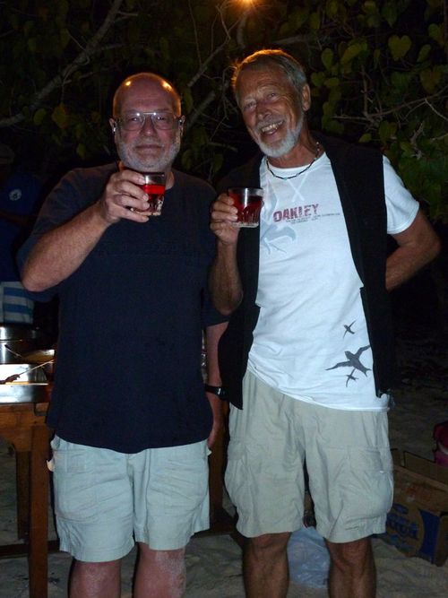 I shall end by noting that strange bioluminescent phenomena were on display in other ways that night on Komodo’s pink beach – note the dazzling effects on the head of the old guy next to François in this photograph: