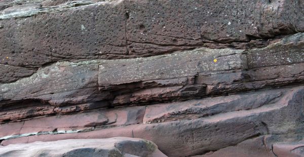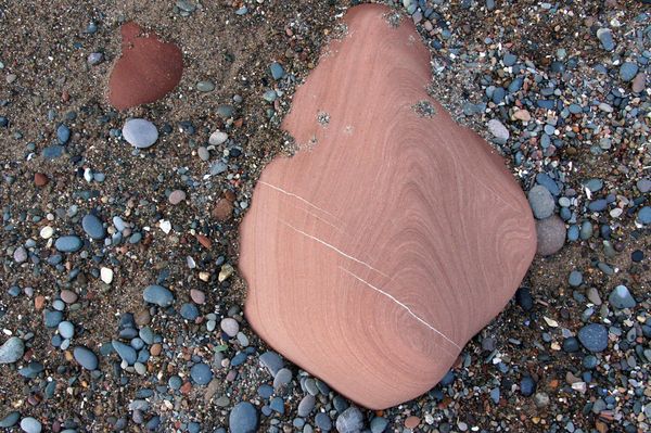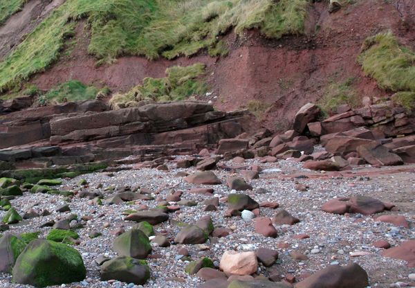 The sand grains of the St. Bees are fine-grained, angular and abrasive, their iron oxide coatings distinguishing them dramatically from the beach sands that reflect the rivers working away at the rocks of the Lake district and Southern Scotland. Where a small gully washed the local ingredients from the cliffs down on to the beach, the contrast was striking, a comparison amplified under the microscope: