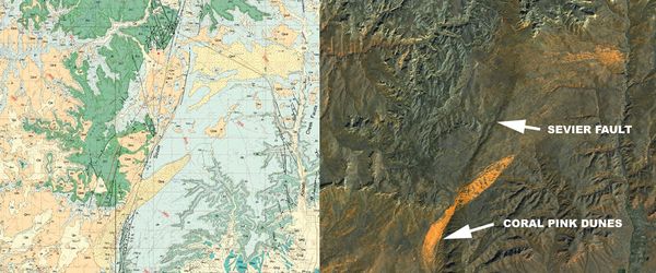 On the left is exactly the same area but shown as a geological map, the rocks of different ages appearing in different colours, the faults as black lines. To the east of the Sevier fault, the landscape is dominated by the light blue rocks of the Navajo Sandstone, to the west, the green of the Carmel Formation, mostly made up of limestones. The Navajo was deposited during the Lower Jurassic, around 185 million years ago, the Carmel later, on top of it, around 165 million years ago. So the map shows clearly that the movement on the Sevier fault is down to the west – the rocks of the Carmel are younger than the Navajo in the hills to the east, and have been completely removed by erosion on the uplifted side of the fault.
