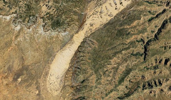 It’s the local winds that explain why these dunes are where they are. Just to the north-east of the dunes is a significant “notch” in the ranges of the plateau. The prevailing winds blast sand south-westwards, are funnelled through the notch, and, as they emerge and diminish, can no longer carry the sand, dropping it to feed the dunes. If you look at this on Google Earth, you can almost feel the sands streaming through the gap in the hills: