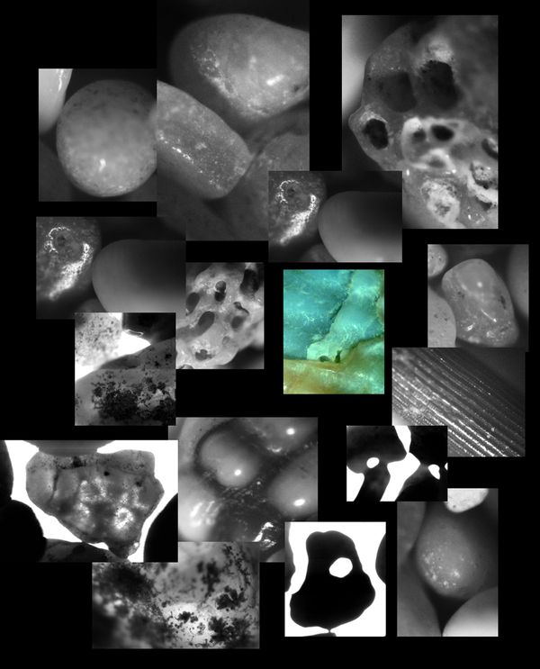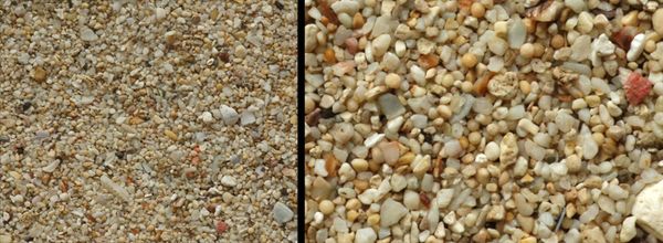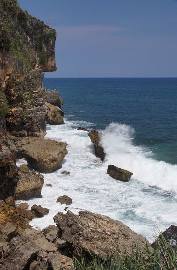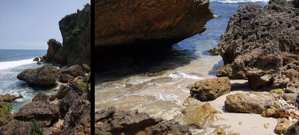 Sand from perhaps the smallest “beach” that I have visited and sampled. One of the items on the varied agenda of a recent long weekend in Central Java (varied in the way that part of the world uniquely and fascinatingly offers) was an exploration of a few of the small beaches on Java’s south coast. My intention was to avoid the crowds at the large, popular, beaches (the day of the visit being Sunday) and find a couple of the small coves that nestle between the spectacular cliffs of that part of the coast. The first destination was Ngobaran – and it certainly fulfilled the criterion of a “small beach.” Dramatic and rugged limestone cliffs face the incoming waves of the Indian Ocean, and the constant kinetics of the place leave little opportunity for sand grains to gather. But, in a small area sheltered by massive boulders, a patch of coarse sand had accumulated: