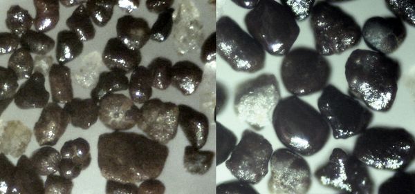 But in these photos, it’s clear that this geoalchemy has gone even further – bizarre steel-black crusts seem to drape over the outcrops, as if something molten had been poured on them. Molten, no, but chemical, yes. The conspiracy of mineral-laden water infiltration, fluctuations in the water table, and original heterogeneity of the sandstones, has caused the formation of duricrusts, hard, irregular, iron-cemented bodies of sandstone, sometimes also called ferricrete (i.e., ferruginous concrete). The primary mineral is probably limonite, itself a mixture of hydrated iron oxide minerals; there may well be other components in there too, quite possibly manganese, for example. And this explains the strange appearance of the beach sand when scrutinised in detail (see the image at the head of this post). It looks as if one of those waiters who lugs around an unnecessarily huge pepper mill had stopped by and sprinkled his wares in the sand – myriads of little black grains. Look more closely, and there, in amongst the sharp and angular quartz grains, are what look like little rounded pellets. They are not magnetic, but they are relatively heavy – a little amateur panning in the kitchen easily separated them out. I am almost a hundred per cent sure that these are limonite grains, further smoothed and rounded from their original shape by the wear and tear of the waves; here are some of them in isolation (plus a free foram):