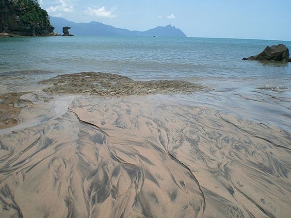 Ashes to ashes, sand to sand – recycling is the name of the game on our planet. Essentially every sand grain that you might encounter washing along the beach, rolling in a river, skipping along the surface of a dune, is on but the latest of many journeys, travels punctuated by long periods of entombed repose, cycles of incarceration and liberation that have gone on for tens, hundreds, of millions of years. This week’s Sunday sand is a great example of this, from the Bako National Park on the coast of Sarawak, Malaysian Borneo.