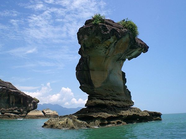 All this chemical activity has created huge variations in the hardness of the sandstones, and thus their resistance, or otherwise, to weathering and erosion. And it is this that has enabled the sculpting of the weird, wonderful, and artistic shapes of the cliffs of Bako National Park. An icon of this area is a magnificent isolated sea stack, along the base of which can be seen another weathering phenomenon common here – tafoni again (one of my favourite topics and an inspiration for the works of Gaudi).