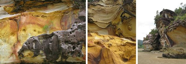 Thirty million years or so ago, great rivers carried cargoes of newly-liberated sand down from the mountains and dumped them in deltas along an old shoreline quite unrelated to today’s. Geochaos and geochemistry buried and lithified the sediments, turning them into sandstones that would later be unceremoniously heaved back up to the surface; for the moment, they play a starring role in the dramatic and colourful coastal scenery of this small National Park, but they are constantly exposed to the assaults of waves and the steamy tropical climate, disintegrating to release their grains back onto the beaches and launching them on their next journey. This sand is a perfect example of the recycling of local ingredients. But those ingredients include a little something extra. Over time, mineral-charged waters circulated through the sandstones, leaching and depositing minerals as the acidity of the local microenvironment changed. Most common among these minerals are iron oxides and hydroxides that provide the palette of pigments for the chemical artistry on display in these cliffs: