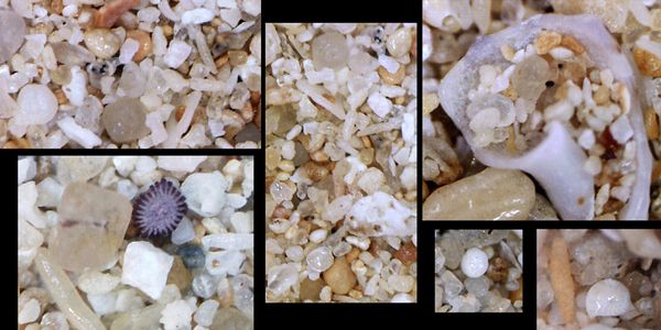 Many stretches of Sri Lanka’s beaches lost huge amounts of sand, but nature seems to have achieved effective beach nourishment and restoration. I can find no evidence of a human contribution to the re-supply of sand, only the opposite – extensive sand mining that reduced the coastal supply and inhibited the natural processes. So who knows exactly what stories these sand grains tell? In all likelihood some were sucked from the beach, only to be thrown back as the tsunami surged, joined probably by others that had been residing peacefully offshore, among the coral reefs whose fragments we see in the sand. But this is a spectacular and diverse sand: the ubiquitous quartz grains there, but overwhelmed by biogenic detritus. Sponge spicules, coral fragments, sea urchin spines, the inevitable forams, bits and pieces of shells as well as tiny complete ones, all testimony to the great organic engine of the tropical ocean. And what exactly that little beautiful blue and grey “cogwheel” is, I really don’t know.