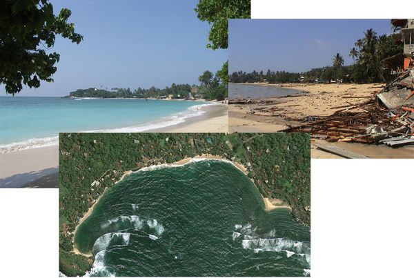 Heralded as one of the finest beaches in the world, Unawatuna lies close to the southern tip of Sri Lanka. The sand contributes to the heralding – on every scale – but this sand must have tales to tell. The resort was devastated by the 2004 tsunami, and a quick search of the internet reveals harrowing stories typical of those from around the Indian Ocean that appalling day. The before and after images below do not begin to evoke the full extent of the catastrophe that hit the residents that day, but the Google Earth image (from before the tsunami) shows the complex way in which the shape of the coast refracts and focuses even normal ocean waves – the chaos of what this natural lens created when successive tsunami surges hit can only be imagined.