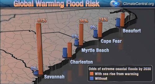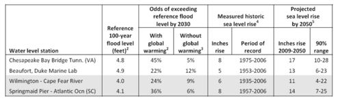 - Odds of a 100‐year flood or worse by 2030, with sea level rise from global warming: 24% (odds without global warming: 9%)