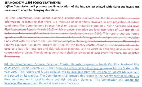 Perhaps the most impressive accomplishment to date was the complete reversal of the draft policy of CRC regarding Sea Level Rise (SLR). The draft policy presented by the Science Panel of the CRC mandated a planning component of 39 inches of SLR across the CAMA area. NC 20 Board members met in a private meeting with the Chair of the CRC and carefully laid out the unscientific assumptions used in the draft report, showing the numerous errors and inconsistencies. In the final presentation, all “mandates” were removed and the final document showed a sensitivity to the needs of the counties, the role of the CRC, and the need for a relationship characterized by scientific advice and assistance on the part of the CRC rather than ironfisted dictates. The “redlined” version of that final document is attached for your review.