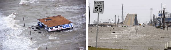 [Photographs: the surge before the storm swamps Galveston Island, Texas, and a fire destroys homes along the beach as Hurricane Ike approaches. (AP Photo/David J. Phillip). Flooding over access road 523 to Surfside beach, caused by Hurricane Ike forming in the Gulf of Mexico, is seen near Surfside Beach, Texas. (REUTERS/Carlos Barria). And http://myhydros.org/more-about-water/storm-surge/]