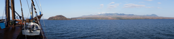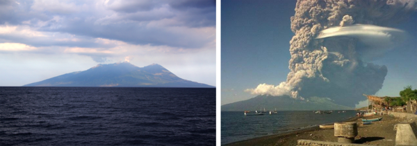 Three years ago we embarked in Bali and headed eastward, across the Wallace Line, and island-hopped for a while around the archipelago of Nusa Tenggara. We sailed past the great volcanic edifice of Tambora, originator of the greatest eruption of modern times and the cause of ‘the year without a summer.’ All was peaceful, although the lines of raised beaches along the shore spoke of volcanic and seismic upheaval. The day before we arrived at Komodo – where there indeed be dragons, not to mention spectacular sands – we sailed past the eastern shores of Sumbawa and I photographed the volcano island of Sangeang Api, benignly dormant in the evening light (above left). Today, the tropical languor has been shattered by several major eruptions of Sangean Api over the last 24 hours (above right).