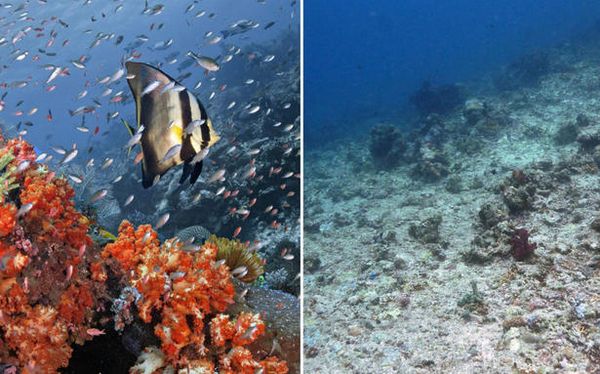 BEFORE: A Pinnate batfish swimming among other fish in Tatawa Besar in the waters of Komodo islands, Indonesia. AFTER: damaged coral reefs in the water of Tatawa Besar, Komodo islands, Indonesia. [Robert Delfs/Michael W. Ishak] I admire corals – not...
