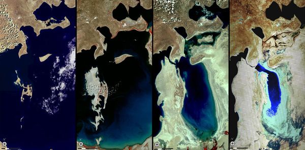 Aral Sea shrinks, central Asia The Aral Sea, located in Kazakhstan and Uzbekistan in central Asia. Left: June 4, 1977. Center left: September 17, 1989. Center right: May 27, 2006. Right: June 3, 2009. Once one of the largest inland...