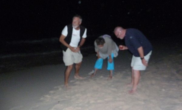 A somewhat blurry photo of a beach at night, clearly some kind of alcoholic beverage in the hands of at least two of the people, one of whom seems be in a state of some excitement, the other two staring...